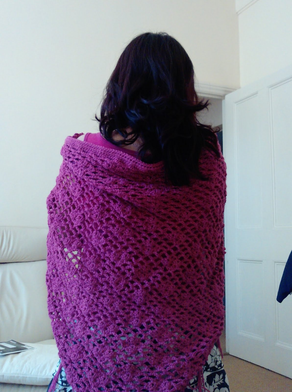 Finally I've finished my shawl... I started this project beginning of June. HUbby and I were out for lunch one day. The sun was shining but the wind was chilly. I had a cardi with me but when I had it on, I was too warm, If I didn't put it on, my arms were feeling the chill of the wind... so Hubby and I were discussing it... hehe... he said I needed a shawl and suggested I made one... I was so impressed with him that day.... heheh.. I loved shawls...old fashioned shawls with tassels... haha and so I made one... Here it is... I love the colour and the size of this!!! hahaha.. now all i need is make a brooch to go with it!!!